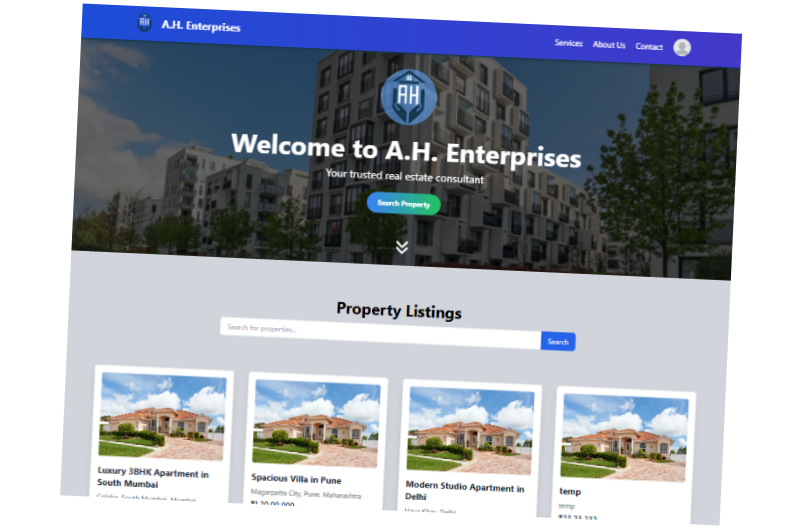 A.H. Enterprises is a sophisticated real estate platform developed using the MERN stack (MongoDB, Express.js, React.js, and Node.js). This application facilitates the management of property listings, with an admin interface for creating and managing listings and a user interface for browsing and searching properties. The backend, powered by Node.js and Express.js, ensures efficient data handling and API management. MongoDB provides a robust database solution for storing property details and user information, while React.js delivers a responsive and dynamic user experience. The application integrates secure authentication for admin access and leverages advanced search functionalities to enhance user interactions.