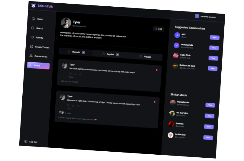 StitchTalk is a dynamic web app crafted using Next.js and TypeScript, designed for engaging conversations, effortless thread creation, and community growth. By leveraging Clerk Auth, MongoDB, Shadcn, and Tailwind CSS, users can seamlessly connect, initiate threads, join discussions, and create their own unique community hubs.